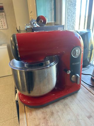 Robot de cocina SOGO en color rojo, ideal para amasar, mezclar y batir. - Modelo: SS-14510 - Potencia: 1000W - Velocidades: 6 - Capacidad del bol: 5L - Incluye accesorios de amasado y batido.