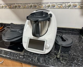 Robot de cocina Thermomix TM5 en color blanco. - Jarra de acero inoxidable. - Pantalla táctil a color. - Botón giratorio para control. - Diseño moderno y compacto. - Con accesorio varoma, mariposa, cestillo y espátula. - 5 libros digitales. Los de la foto+ "Cocina fácil y saludable" La cuchilla no es la original. La espátula está desgastada del uso. La carcasa presenta varias grietas de pequeño tamaño. Las velocidad, el tiempo y el peso dan saltos al programarlos. Esto no impide su correcto funcionamiento, solo que hay que tener un poco de más paciencia.