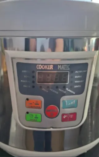 Robot de cocina Cooker Matic con múltiples funciones. - Programas: Arroz, Sopa, Postre, Pasta, Freír, Horno, Vapor, Plancha. - Funciones adicionales: Autolimpieza, Guiso, Yogurt, Lento. - Botones de inicio/mantener y hora.
