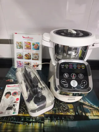Robot de cocina Moulinex Cuisine Companion en color blanco y plateado. Incluye libro de recetas. - Robot de cocina multifunción: salsas perfectas, sopas cremosas, cocina a fuego leno, platos al vapor, masas de pasteles, postres... - Pantalla digital con programas automáticos. - Diseño moderno y funcional. - Accesorios incluidos en su estuche y añado el libro de recetas. Vendo por falta de uso, comencé usándola bastante, pero por falta de espacio la guardé en el armario, y finalmente dejé de utilizarla.