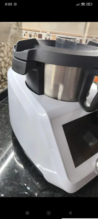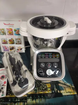 Robot de cocina click and cook de moulinex. La hemos usado 3 veces cuando la compramos y hicimos horchata 2 veces, esta nuevo. Tiene 600 recetas integradas y 32 funciones. pantalla tactil de 7 pulgadas. con todos los accesorios sin estrenar. Con su caja original.