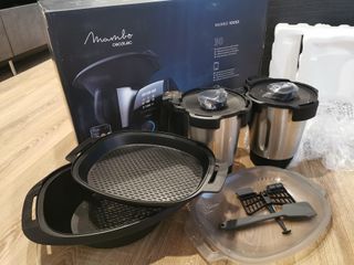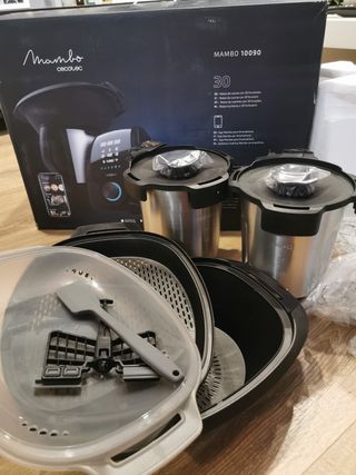 Robot de cocina Mambo Cecotec con jarra de cerámica. - Incluye cuchara Mambomix. - Jarra de acero inoxidable. - Vaporera de dos niveles. - Cuchillas. - Cestillo de hervir. - Mariposa. - Espátula. - Libro de recetas.