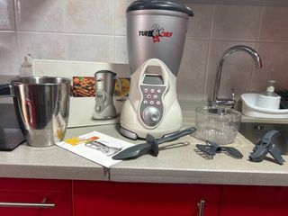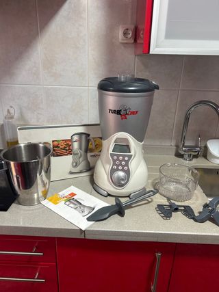 Robot de cocina TurboChef en buen estado, con uso medio. Incluye todos sus accesorios originales para que puedas preparar tus recetas favoritas. - Vaso medidor de acero inoxidable. - Accesorios para mezclar y batir. - Manual de instrucciones.