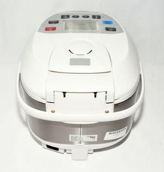 Robot de cocina en color blanco con tapa abierta. - Panel de control con pantalla digital. - Botones de función: Cancelar, Menú, Temp, Cocinar, Calentar/Recalentar, Hora, Min, RSV. - Interior del recipiente de cocción negro. Nuevo sin usar, viene con manual de instrucciones y libro con recetas