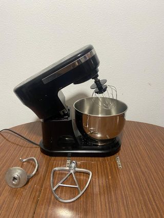 Robot de cocina color negro de la marca EDM. Incluye varios accesorios para tus preparaciones. - Bol de acero inoxidable. - Varillas para montar. - Gancho amasador.