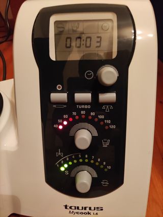 Robot de cocina Taurus Mycook con capacidad de 1.5 litros. Incluye accesorios. - Jarra de acero inoxidable. - Pantalla digital. - Varios niveles de potencia y temperatura.