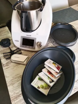 Se vende robot de cocina Thermomix TM5 de Vorwerk. Incluye varios accesorios. - Vaso de acero inoxidable. - Cestillo. - Varoma. - Espátula. - Mariposa. - Libro de cocina 'Frío y natural'. - Libro de cocina 'Sorprendentes invitados'. - Libro de cocina 'De temporada'. - Libro de cocina 'Bocadillos'. Con Cook-key para configurar la plataforma de recetas más grande del mundo