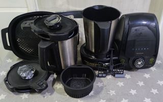 Tiene todos los accesorios que no se han usado nunca. Se vende por no isar pero esta impecable. Incluye libro de eecetas. Hasta 9 modos de cocina diferentes: cocción al vapor, cortar y triturar, cocinar, batir, amasar y emulsionar y elaboración de mermelada y sopa; destacan sus 4 modalidades automáticas (amasar, hacer sopa, mermelada y modo vaporera). 1200W, capacidad de 2,2 litros, dispone también de báscula integrada, temporizador y función turbo. Con Wi-Fi, opción que permite controlarlo desde el móvil, y cuenta con una app con más de 200 recetas diferentes. Limpieza fácil de cuchillas.