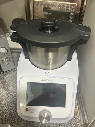 Robot de cocina SilverCrest en buen estado. Es de color blanco y acero inoxidable. - Incluye todos los accesorios que se ven en la imagen. - Dispone de una pantalla digital. - Tiene varios botones para diferentes funciones.