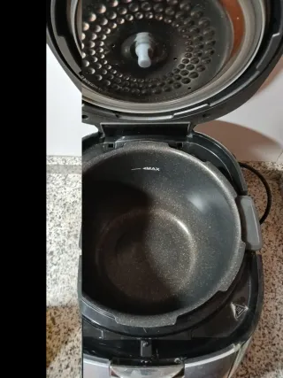 Robot de cocina con muy muy poco uso. Caoavidad: 4 litros 12 funciones programadas Recipiente interior antiadherente Valvula salida de vapor Programacion anticipada 24 horas Accesorios:2 cucharas (arroz y sipa) bandeja cocina vapor. Conservo manuel de instrucciones y recetario