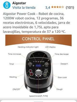 Aigostar Power Cook - Robot de cocina, 1200W robot cocina, 12 programas, 36 recetas electrónicas, 6 velocidades, jarra de acero inoxidable de 1,75L apta para lavavajillas, temperatura de 37 a 120 ºC. Es la versión sin vaporera externa