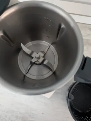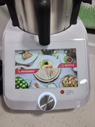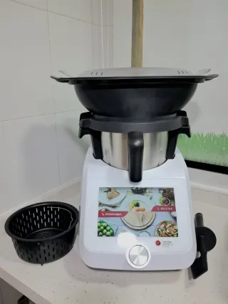 Robot de cocina profesional Thermo, ideal para preparar una gran variedad de recetas. - Diseño moderno en color blanco. - Jarra de acero inoxidable. - Panel de control intuitivo con pantalla digital. - Incluye manual de instrucciones y recetario. se ha usafo muy pocas veces la vaporera esta sin usar le falta la mariposa por eso la doy mas barata