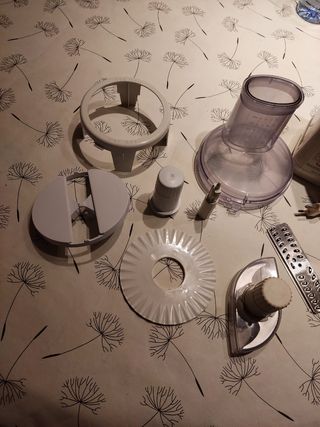 Robot de cocina que a día de hoy está en perfecto uso y funciona perfectamente, como se puede ver en las cuchillas y accesorios, sólo la base redonda blanca tiene un trocito roto pero como es para poner las cuchillas con el palito de en medio, sigue funcionando perfectamente. Vendo porque me he comprado la termomix.