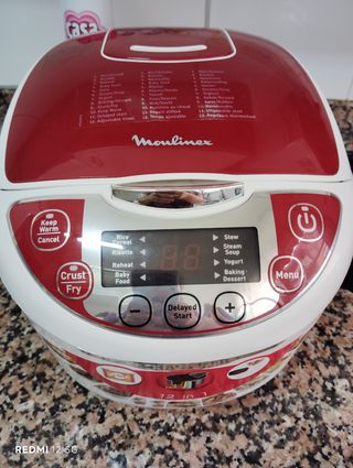 Robot de cocina Moulinex en perfecto estado, como nuevo. Ideal para preparar una gran variedad de platos. - Panel de control con pantalla digital. - Funciones: Stew, Steam, Soup, Yogurt, Baking, Dessert, Rice, Cereal, Risotto, Reheat, Baby Food, Crust Fry. - Botones Keep Warm, Cancel, Delayed Start, Menu y Power. - Diseño moderno en color rojo y blanco.