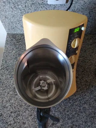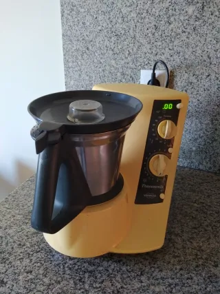 Robot de cocina Thermomix TM21 de Vorwerk en color amarillo. - Jarra de acero inoxidable. - Tapa con cierre de seguridad. - Asa ergonómica para un fácil manejo. - Panel de control con diales y pantalla digital. Para alguien que sepa o quiera reparar y sinó para piezas o plan renove de la marca. El botón de puesta en marcha y de velocidad de la cuchilla a veces se atasca. Funcionando correctamente hasta hace poco.