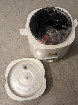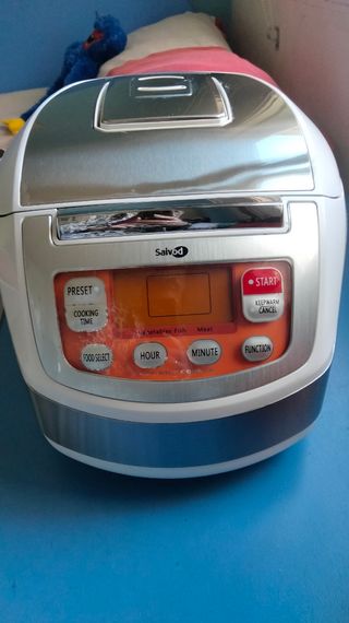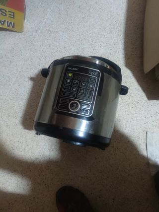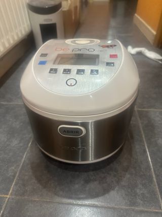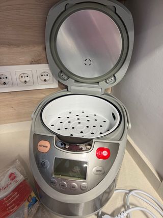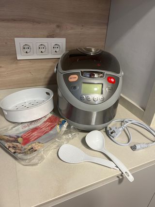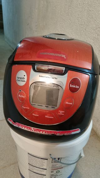 Usado pocas veces, lo vendo porque yo no lo utilizo, lo usaba mi madre. Su precio de compra fue 89€. Es marca JRD, tiene 700W de potencia, 4 litros de capacidad, cubeta antiadherente con fondo de panal de abeja (se ve blanquecina pero es de estar guardada, no se pega), 12 programas ajustables en tiempo y temperatura según el gusto de cada uno. La voz facilita el uso del robot, es programable hasta 24 horas y cuando termina el programa se activa la función de “mantener caliente”. Tiene todos los accesorios (cesto vaporera, cuchara, cucharón y vaso medidor) también incluye el manual de instrucciones y recetario con 200 recetas.