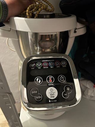 Robot de cocina Taurus Mycook +59 mejor que la Thermomix, marca española y cocina por inducción. - Color blanco. - Panel de control con pantalla digital y mandos giratorios. - Jarra de acero inoxidable. - Cuchillas en buen estado con accesorio aspas plástico mezcladoras - Se incluye espátula también, lo que se ve en las fotos. Perfecta para salsas, purés, cremas, etc. Funcionando perfectamente, algunos golpes estéticos pero nada de importancia. Sólo vendo en persona.