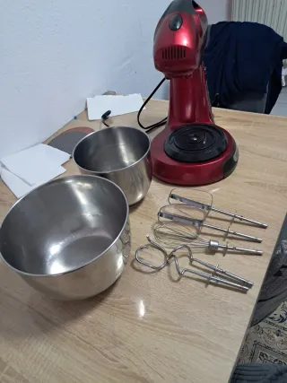Robot de cocina de color rojo, ideal para preparar tus recetas favoritas. Incluye varios accesorios para diferentes usos. - Bol de acero inoxidable. - Varillas batidoras. - Ganchos amasadores.