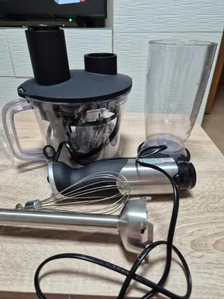 Robot de cocina con varios accesorios para preparar tus comidas. - Incluye vaso medidor. - falta la piesa de union de las Varillas - Procesador de alimentos. - tritura, 2 placas para rayar y 2 para cortar. - Batidora de acero Usada una ves, la tenia en la cabaña.