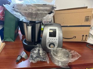 Robot de cocina de la marca española Cecotec similar a Thermomix en cuanto a prestaciones (1500W, 3,3 L de capacidad en la jarra de acero inoxidable...). Incluye 23 funciones (TROCEA, PICA, TRITURA, MUELE, PULVERIZA, RALLA, BATE, MONTA, EMULSIONA, MEZCLA, COCINA, REMUEVE, COCINA AL VAPOR, ESCALFAR, CONFITAR, AMASA, HIERVE, MANTIENE CALIENTE, FERMENTA, COCINA DE PRECISIÓN GRADO A GRADO, BAÑO MARÍA, RECALIENTA Y TURBO. Incluye todos los accesorios: aspas normales (cuchillas), mariposa, pala de amasado, utensilios de coccion al vapor que nunca han sido utilizados... y la caja original, instrucciones y recetario