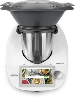 Robot de cocina Thermomix TM5 en color blanco. - Jarra de acero inoxidable. - Pantalla táctil. - Botón giratorio. - Asa integrada. - Mariposa - Espátula - Accesorios repostería - Cubilete