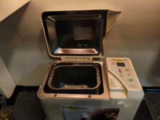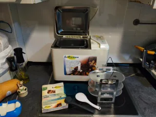 Robot de cocina La Cocinera, ideal para preparar tus recetas favoritas. - Incluye accesorios para hacer pan, cubetas para amasar y cocinar, y manual de instrucciones con recetas. - Gran cantidad de programas diferentes, capaz de mezclar, amasar, cocinar y hornear con sólo introducir los ingredientes en crudo. También mantiene la comida caliente, y se puede programar en diferido. - Diseño compacto y funcional. - Tiene un toque en una esquina de la tapa que no le resta funcionalidad.