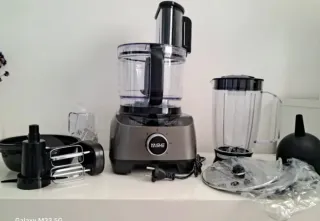 Robot de cocina multifunción en color negro y plateado. - Diseño moderno y compacto. - Panel de control digital con pantalla. - Incluye todos los accesorios de la foto y libro de recetas.