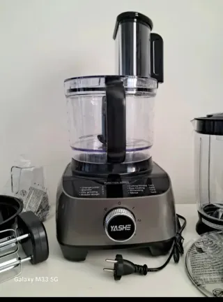 Procesador de alimentos YASHE, completamente nuevo y en su empaque original. - Diseño moderno en color gris. - Incluye varios accesorios para diferentes funciones. - Base estable con control de velocidad.