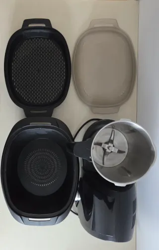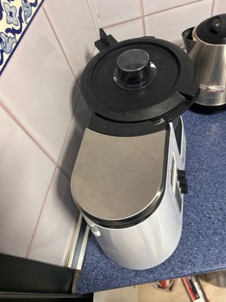 El aparato funciona correctamente y se ha utilizado siempre en un entorno doméstico. Incluye todos los accesorios originales: jarra de acero inoxidable con cuchillas, cestillo, vaporera, tapa, tapa interior, accesorios y cable de alimentación. Importante: el asa de la jarra está dañada (se aprecia en las fotos). El robot funciona sin ningún problema, pero el comprador debe tener en cuenta que la jarra puede repararse o sustituirse por una nueva compatible. Por este motivo, el precio ya está ajustado. Es un robot robusto, sencillo y muy práctico, ideal para uso diario o como primer robot de cocina, sin necesidad de conexión WiFi.
