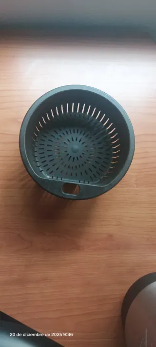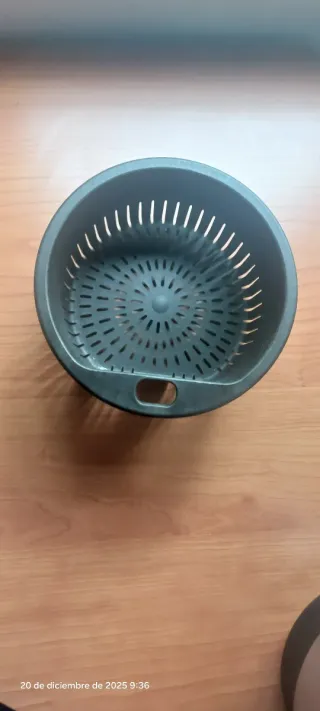 Cesto para robot de cocina Mambo. - Color gris oscuro. - Diseño con múltiples orificios para el drenaje. - Asa integrada para facilitar su manejo.