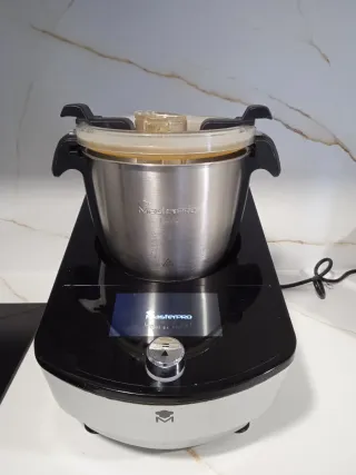 Robot de cocina MasterPRO en perfecto estado, casi sin usar. -Accesorios sin estrenar. -(Disco de cortes, espátula, mariposa, cuchillas, etc...) -Vaso grande de acero inox. -Vaporera. - Cesto de cocción. -Pantalla tàctil con múltiples recetas. - Diseño moderno y funcional. - Acabado en acero inoxidable y negro.