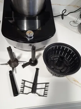 Vendo mi robot de cocina Mycook Touch de Taurus, prácticamente nuevo, solo 3 usos. Es una herramienta fantástica para cocinar. - Incluye todos los accesorios que se ven en las fotos. - Perfecto estado. - Manual de instrucciones incluido. Cuenta con pantalla táctil de 7 pulgadas y Wi-Fi para acceso a recetas online. Utiliza tecnología de inducción para cocinar de 40 a 140 grados centigrados, lo que permite un calentamiento rápido y uniforme. Tiene 10 velocidades, función Turbo, y balanza integrada para pesar ingredientes directamente en la jarra de acero inoxidable de 2 litros. Ofrece funciones como triturar, batir, amasar, etc.Medid