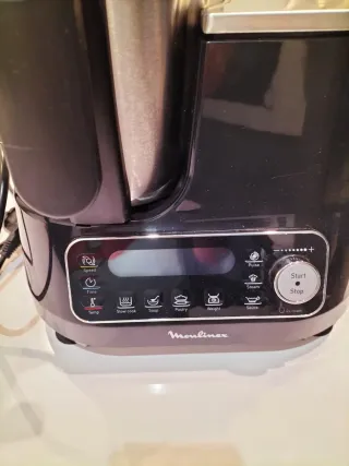 Moulinex i‑Companion HF9001 – Robot de cocina Bluetooth. 13 programas automáticos y 13 velocidades + modos manual, controlando tiempo, temperatura (30‑130 °C) y velocidad. Capacidad 4,5 L (6 personas). Potencia 1.550 W. Incluye 6 accesorios: cuchilla picadora Ultrablade, batidor, mezclador, amasador/triturador y cesta de vapor. Bol, tapa y accesorios aptos lavavajillas. Con app Companion para recetas guiadas y control desde móvil. Cocina sopas, guisos, masas, salsas y al vapor fácil y rápido. Ideal para familias o quienes quieren ahorrar tiempo en la cocina. Precio compra 750€. Poco uso.