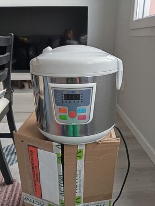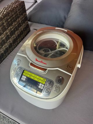 Olla programable Moulinex en buen estado. - Ideal para cocinar fácilmente. - Incluye accesorios como vaporera. - Diseño elegante y compacto. - 3.5 litros 8 programas de cocción que ofrecen una gran versatilidad para cocinar todos tus platos favoritos. Panel de control LED fácil de usar. El robot de cocina multifunción es esencial para ahorrar tiempo cuando preparas tus recetas preferidas