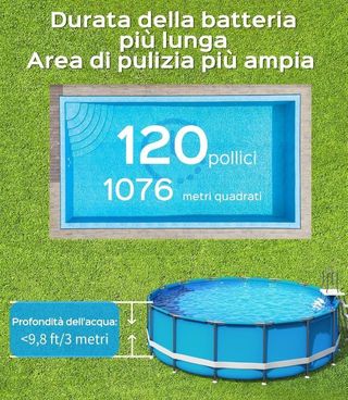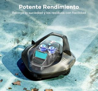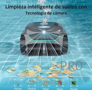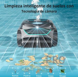 Robot automático para limpieza de piscinas con batería recargable de 6600 mAh y autonomía de hasta 130 minutos. Equipado con dos motores de 50 W, filtro fino de 180 μm, cepillo inferior y entradas de succión extra grandes para recoger polvo, hojas, arena y suciedad. Incluye navegación inteligente, cambio automático de dirección y parada junto a la pared cuando la batería se agota. Apto para piscinas elevadas o enterradas, fondo plano (pendiente <15°), hasta 100 m², cualquier revestimiento (PVC, azulejos, vinilo). Dimensiones aproximadas 37×34×18 cm, peso 3,5 kg. Se enciende con un botón y se limpia fácilmente. Solo incluye robot y c