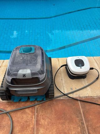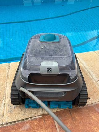 Robot limpiafondos de la marca Zodiac, diseñado para mantener tu piscina impecable. Su diseño combina tonos grises y turquesas, aportando un toque moderno. Less than 1 year old. - Fabricado en plástico y goma para mayor durabilidad. - Ruedas de goma para un desplazamiento óptim