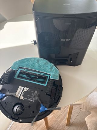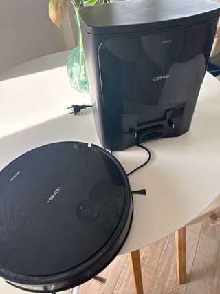 Robot aspirador Conga en color negro. Diseñado para facilitar la limpieza del hogar. - Base de carga incluida auto vaciado - Cable de alimentación. no funciona el auto vaciado y encendido