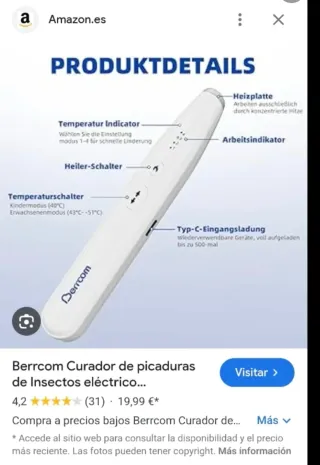 Dispositivo para aliviar picaduras de insectos. - Incluye cable de carga USB. - Diseño en color blanco y rosa. - Incluye manual de instrucciones.