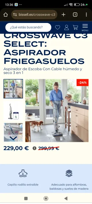 Aspirador de escoba Bissell Crosswave C3 Select, ideal para suelos duros. Limpia en húmedo y en seco. - Modelo: Crosswave C3 Select - Tipo: Aspirador de escoba - Funciones: Limpieza en húmedo y en seco - Uso: Suelos duros, prácticamente nuevo con garantía hasta agosto de 2027 ,vendo por mudanza
