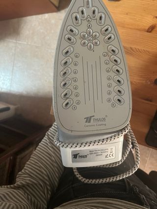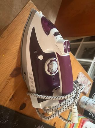 Plancha de vapor con un diseño moderno en tonos morado y blanco. Ideal para el cuidado de la ropa. - Depósito de agua. - Selector de temperatura. - Base para planchar. Una vez usada