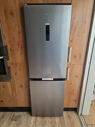 Frigorífico vertical de color plateado. - Diseño moderno y elegante. - Tirador metálico. - Panel de control digital.