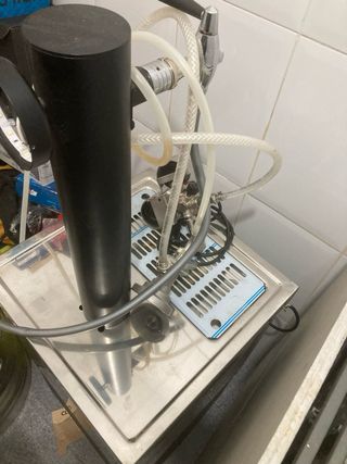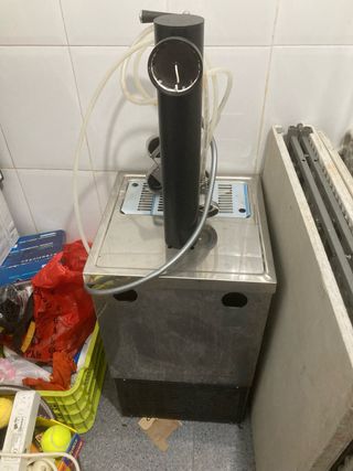 Dispensador de cerveza con grifo. - Estructura metálica. - Grifo negro con detalles plateados. - Indicador circular en el grifo.