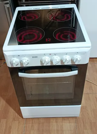 Cocina eléctrica con vitrocerámica de la marca Svan. Cuenta con cuatro fuegos y horno. - Encimera de vitrocerámica. - Cuatro zonas de cocción. - Horno. - Mandos frontales.