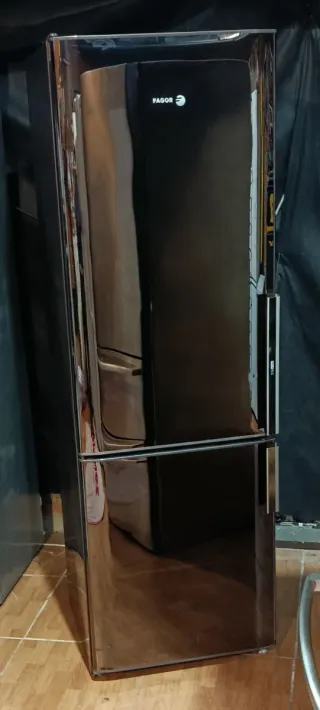 Frigorífico de diseño moderno y acabado brillante. - Color plateado/negro. - Puerta con logo Fagor.