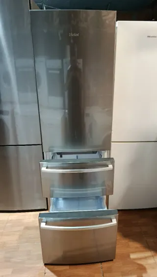 Frigorífico Haier de 190 cm de alto y 60 cm de ancho. Diseño moderno con acabado plateado. - Dos cajones inferiores. - Tiradores metálicos.