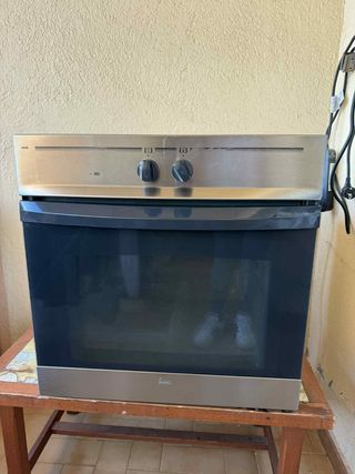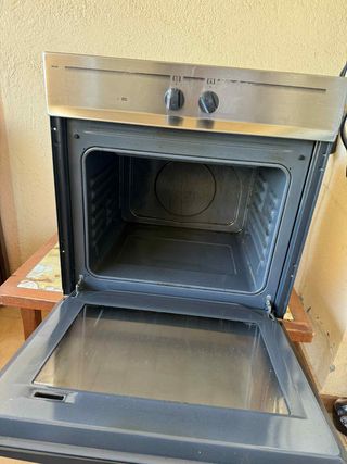 Horno de cocina en buen estado, funciona perfectamente. Ideal para tu hogar. - Acabado en acero inoxidable. - Puerta de cristal. - Dos mandos giratorios para control de temperatura y funciones.