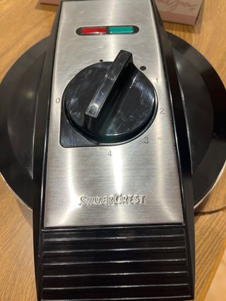 Gofrera de la marca Silvercrest con control de temperatura. - Indicadores luminosos de encendido y listo. - Selector de temperatura de 0 a 4. - Diseño moderno en acero inoxidable y negro.