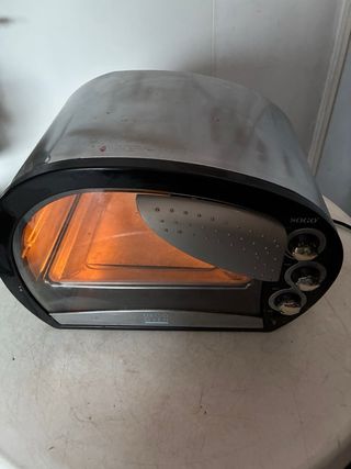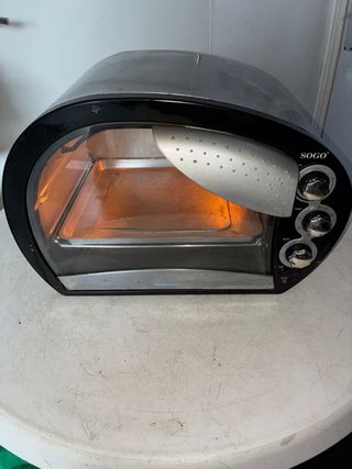 Horno eléctrico SOGO con un diseño moderno y compacto. - Color negro y plateado. - Puerta de cristal. - Mandos giratorios para control de temperatura y tiempo.