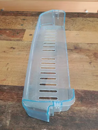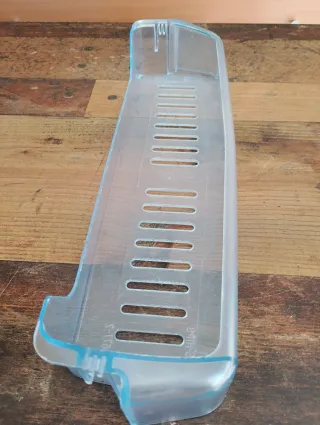 Estante de plástico transparente para nevera, con diseño alargado y bordes en azul claro. Ideal para organizar botellas y otros productos. - Material: Plástico transparente. - Color de los bordes: Azul claro. - Diseño con múltiples ranuras. - Forma alargada.