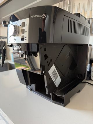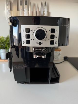 Cafetera automática DeLonghi Magnifica S en color negro. - Diseño moderno y compacto. - Panel de control intuitivo con dial. - Vaporizador para espumar leche. - Bandeja de goteo extraíble.